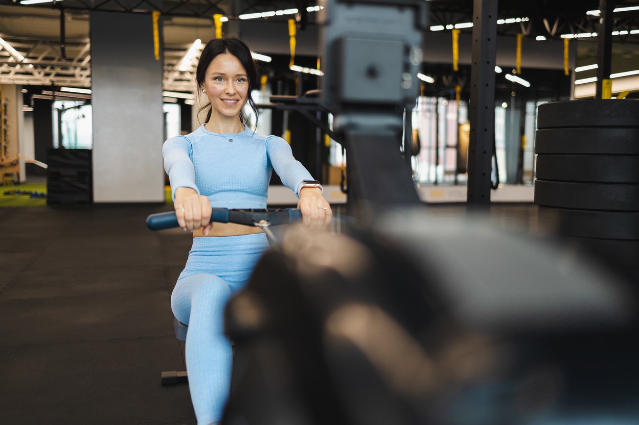 Cheerful woman in blue sportswear on rowing machine. Rowing exercise in the gym